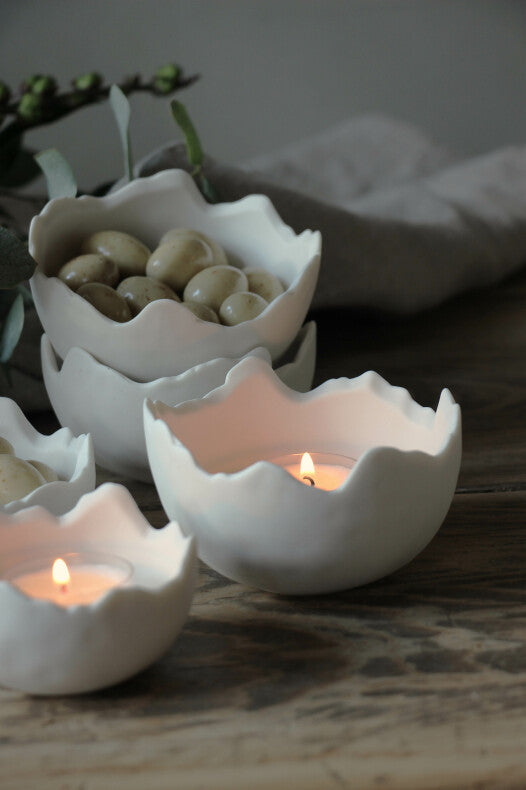 - Användningsmöjligheter: Äggskal, skål, ljushållare