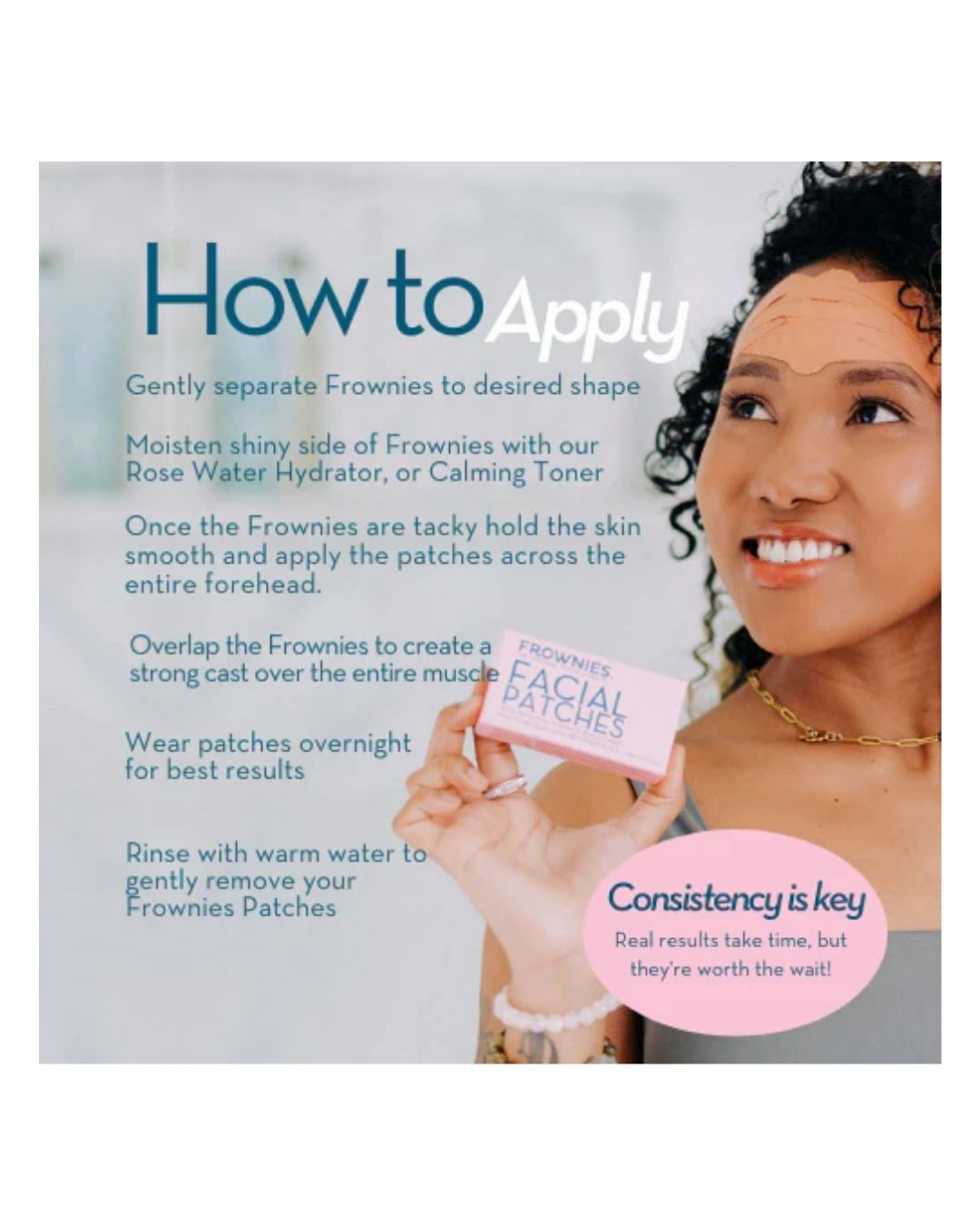 S: Se till att du applicerar plåstret på nytvättad hud och att all din hudvård absorberas helt. Frownies fäster inte bra ovanpå en tjock, tung nattkräm eller ansiktsolja. Plåstret kan också vara lite för vått eller inte tillräckligt vått. Om du använder Rose Water Hydrator Spray räcker ett eller två pumptryck. Att fördela vätskan med fingret är också bra. Att låta det våta plåstret sitta i 15 sekunder innan du applicerar det hjälper att häftämnet att bli klibbigt innan du placerar det på huden.