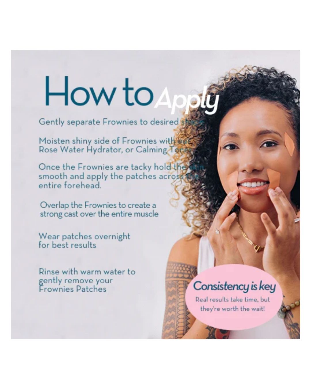 S: Se till att du applicerar plåstret på nytvättad hud och att all din hudvård absorberas helt. Frownies fäster inte bra ovanpå en tjock, tung nattkräm eller ansiktsolja. Plåstret kan också vara lite för vått eller inte tillräckligt vått. Om du använder Rose Water Hydrator Spray räcker ett eller två pumptryck. Att fördela vätskan med fingret är också bra. Att låta det våta plåstret sitta i 15 sekunder innan du applicerar det hjälper att häftämnet att bli klibbigt innan du placerar det på huden.