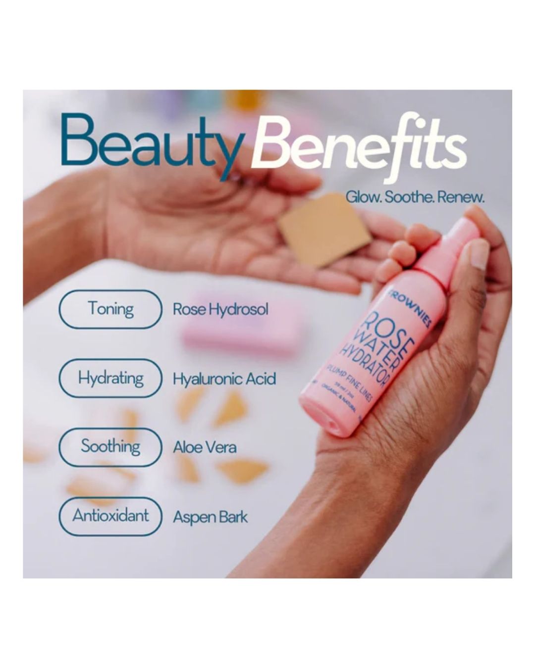 Frownies Rose Water Hydrator Spray är ett enkelt sätt att hålla huden återfuktad och i balans – när som helst under dagen.